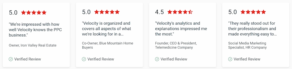 Velocity is known for hands-on Google Ads management, real estate–specific strategy, and clear reporting that prioritizes qualified conversations and deal potential, not vanity metrics. As a smaller, performance-first agency, every account receives senior-level oversight, rapid optimization, and ongoing testing, not “set it and forget it” campaign management.